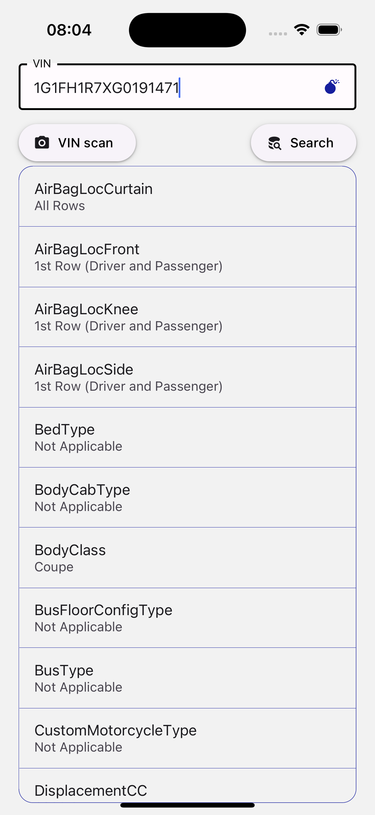 VINDecoding app is your ultimate tool for decoding Vehicle Identification Numbers (VINs). Powered by the trusted National Highway Traffic Safety Administration (NHTSA) database, our app provides comprehensive vehicle details for cars, trucks, motorcycles, and more.